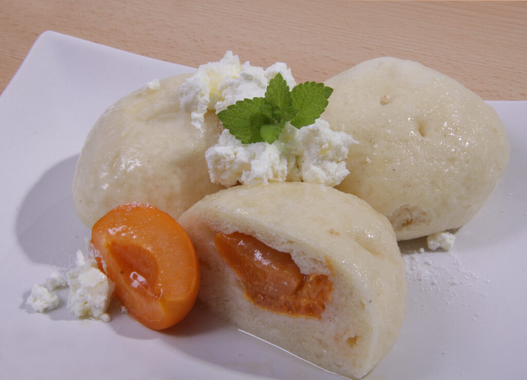 Dubenecký ovocný kynutý knedlík plněný meruňkami. Ruční výroba. Vařený ve vodě. Balený na tácku 5ks.